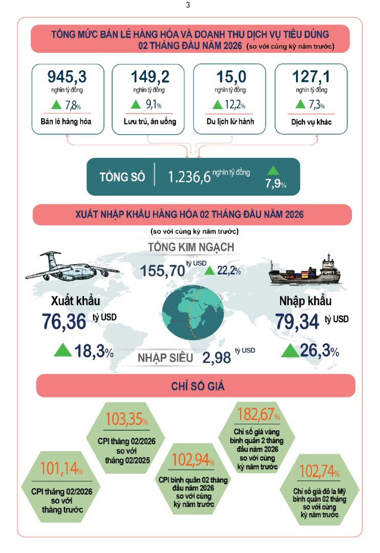 – Chỉ số giá tiêu dùng (CPI) tháng 02/2026 tăng 1,14% so với tháng trước; tăng 1,19% so với tháng 12/2025 và tăng 3,35% so với cùng kỳ năm 2025. Bình quân hai tháng đầu năm 2026, CPI tăng 2,94% so với cùng kỳ năm trước; lạm phát cơ bản tăng 3,47%.