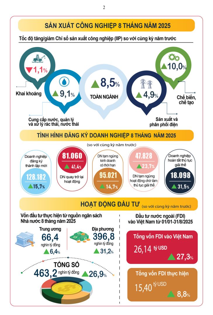 – Sản xuất công nghiệp tháng Tám tiếp tục duy trì đà tăng trưởng. Chỉ số sản xuất công nghiệp (IIP) tháng Tám ước tăng 2,2% so với tháng trước và tăng 8,9% so với cùng kỳ năm trước. Tính chung tám tháng năm 2025, IIP ước tăng 8,5% so với cùng kỳ năm trước (cùng kỳ năm 2024 tăng 8,4%).