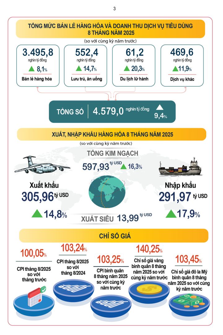 Tổng mức bán lẻ hàng hóa và doanh thu dịch vụ tiêu dùng theo giá hiện hành tháng Tám ước đạt 588,2 nghìn tỷ đồng, tăng 2,6% so với tháng trước và tăng 10,6% so với cùng kỳ năm trước. Tính chung tám tháng năm 2025, tổng mức bán lẻ hàng hóa và doanh thu dịch vụ tiêu dùng theo giá hiện hành ước đạt 4.579,0 nghìn tỷ đồng, tăng 9,4% so với cùng kỳ năm trước (cùng kỳ năm 2024 tăng 8,9%), nếu loại trừ yếu tố giá tăng 7,2% (cùng kỳ năm 2024 tăng 8,0%).