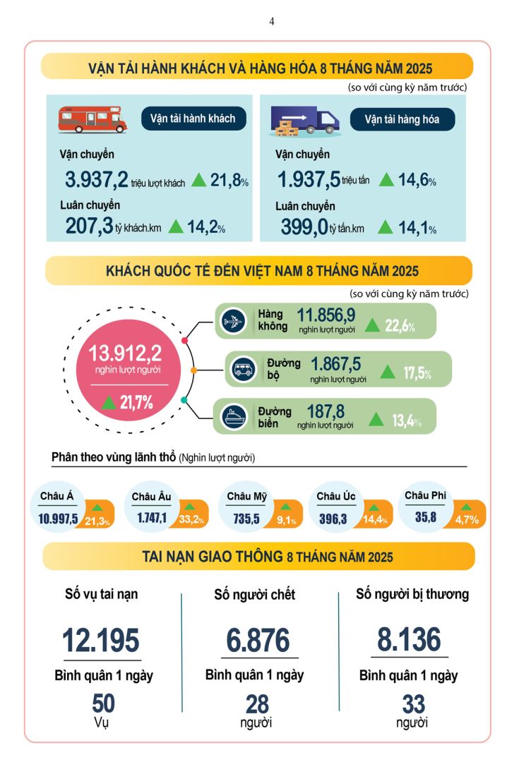 Vận tải hành khách tháng Tám ước đạt 542,6 triệu lượt khách vận chuyển, tăng 2,2% so với tháng trước và luân chuyển 27,8 tỷ lượt khách.km, tăng 2,2%. Tính chung tám tháng năm 2025, vận tải hành khách ước đạt 3.937,2 triệu lượt khách vận chuyển, tăng 21,8% so với cùng kỳ năm trước và luân chuyển đạt 207,3 tỷ lượt khách.km, tăng 14,2%.